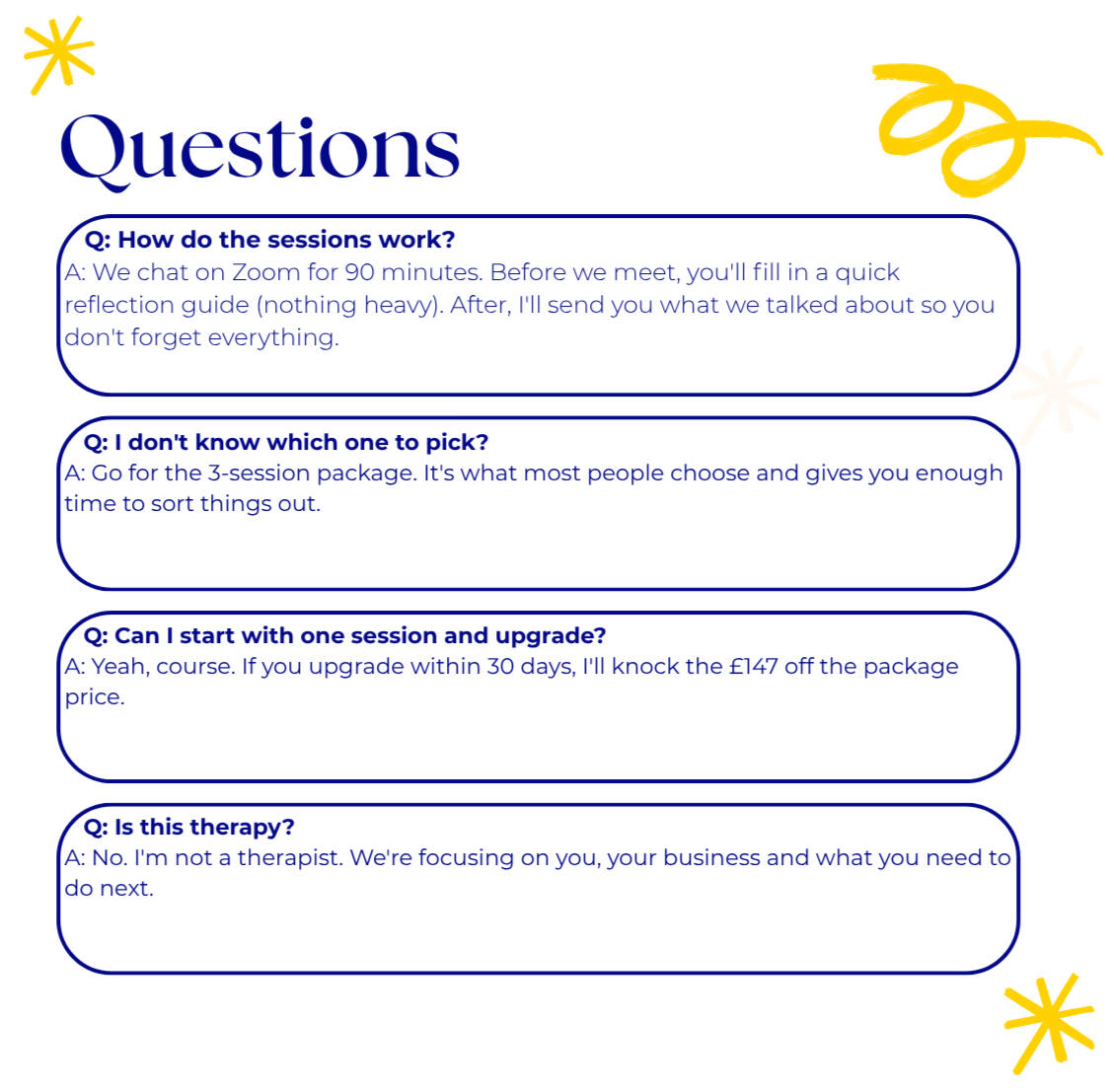 Plot twist: You already know what you need to do. You just need someone to shut up and give you space to think it through.I'm not here to fix you or sell you my seven-step framework. I'm here to help you figure out what actually works for YOUR brain, YOUR life, YOUR business.No bullshit. No pretending. Just real conversations with someone who gets it, because I've lived it too.